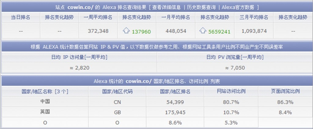 由于众多网友的鼎力支持,.CO域名大本营——CoWin.co网站已于近期进入Alexa排名前50万位。这个排名仅供参考,但也让人颇受鼓舞。感谢大家的支持,让我们继续努力,合作共赢,赢在域名。