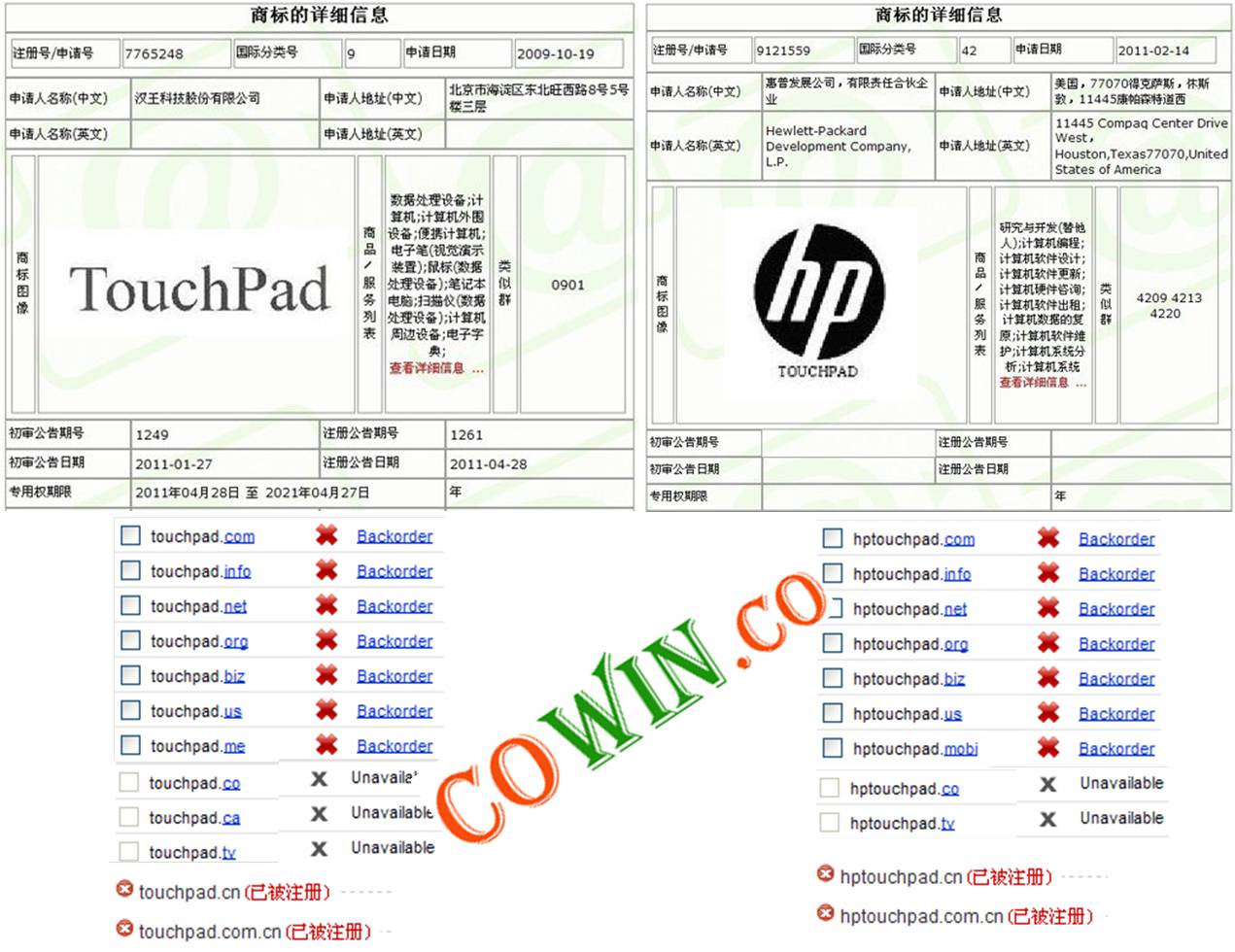 除了商标之外,coWin.co通过查询发现,与TouchPad和HPTouchPad相关的主流域名都已经被注册,包括中国的.com.cn和.cn两个重要后缀。