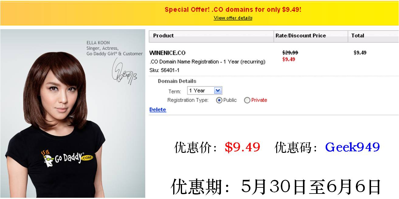 这次活动的优惠码之一是“Geek949”。coWin.co通过注册一个.co域名,验证此优惠码正确无误。