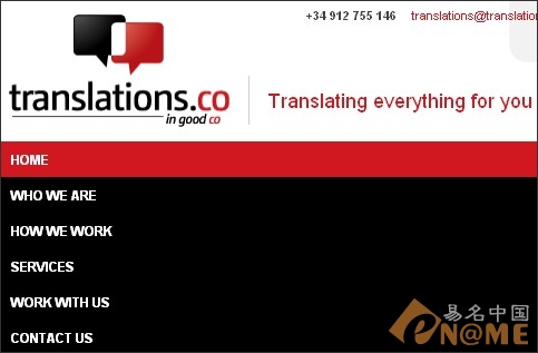 Whois查询了解,Translations.co.uk域名于2002年注册,有9年注册时间,域名现持有者显示为西班牙的Translations Us, S.L. 另外,Translations主流后缀.com/.net/.biz/.org/.co被注册,其中Translations.com域名已被建站运营。