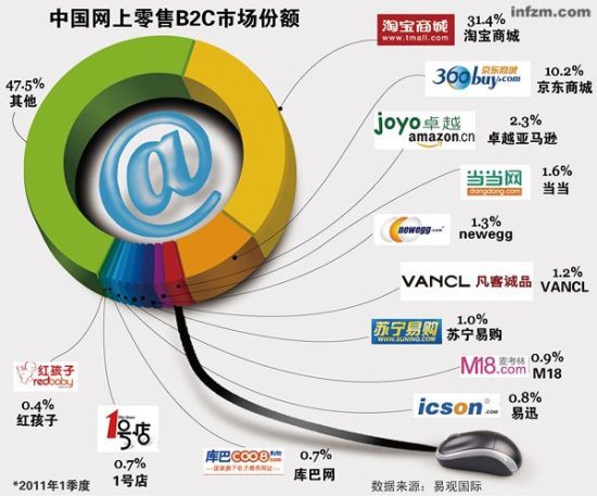 但几年下来,市场培育得差不多了。艾瑞公司的报告称,2010年B2C市场老大依然是淘宝商城,成交规模接近300亿元。要知道,国美全国千家店铺2010年上半年销售额才249亿元。