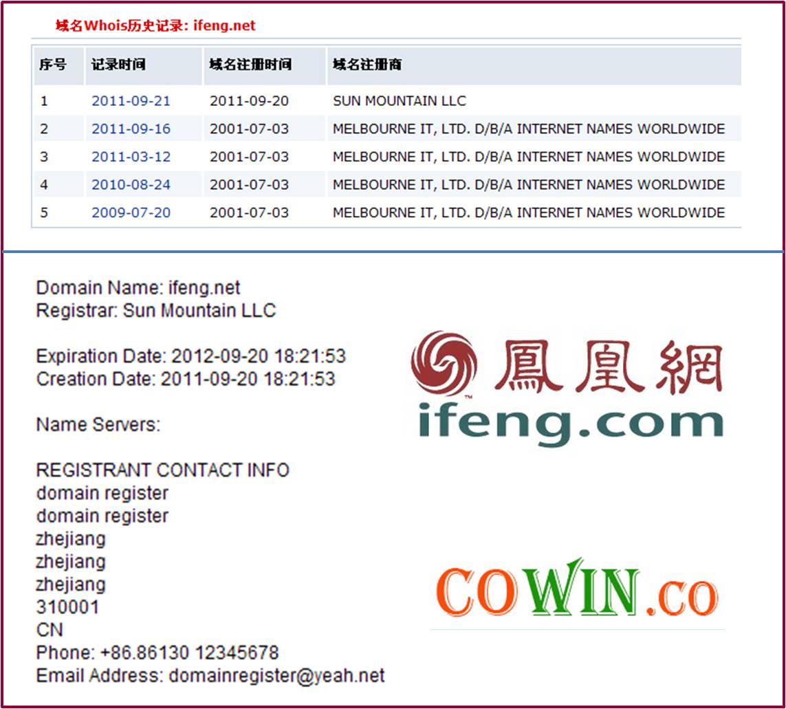 通过查询Whois的历史纪录可以发现,ifeng.net域名早在2001年7月就被注册,至今已超过10年。ifeng.net域名的原注册者来自美国,域名注册商为一家澳大利亚公司(MELBOURNE IT)。