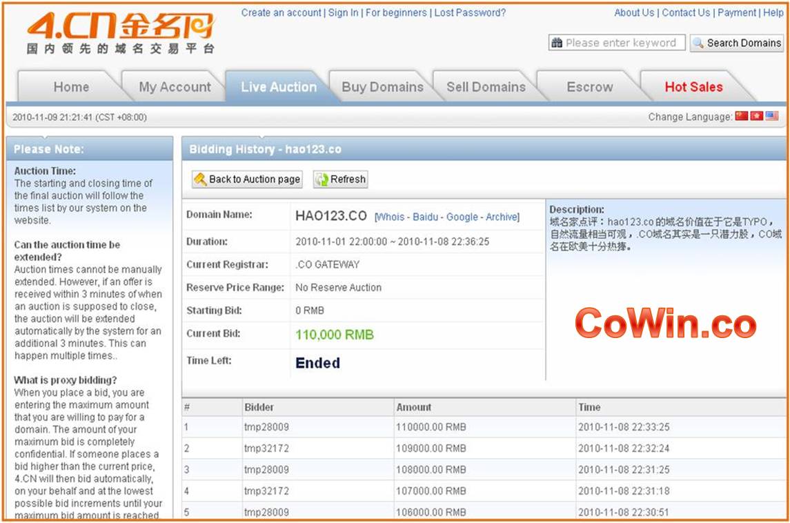 金名网(www.4.cn)在昨天夜里11点半结束了Hao123.co域名的拍卖。最终,代号为TMP28009的竞拍者以11万元人民币的价格胜出(竞拍详情:http://x.co/KDpK)。这个价格似乎让众多域名投资者感到意外,因为竞拍前大家似乎并不看好这个.CO域名。