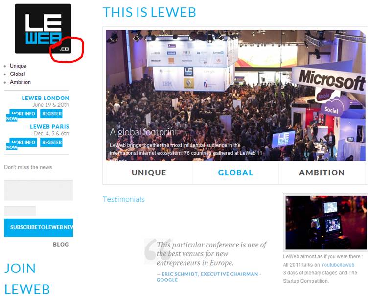 欧洲最大的科技会议之一的LeWeb (法语,即The Web之意)将网站域名由LeWeb.net变更为LeWeb.co,这无疑又是一个对.CO域名发展利好的消息。